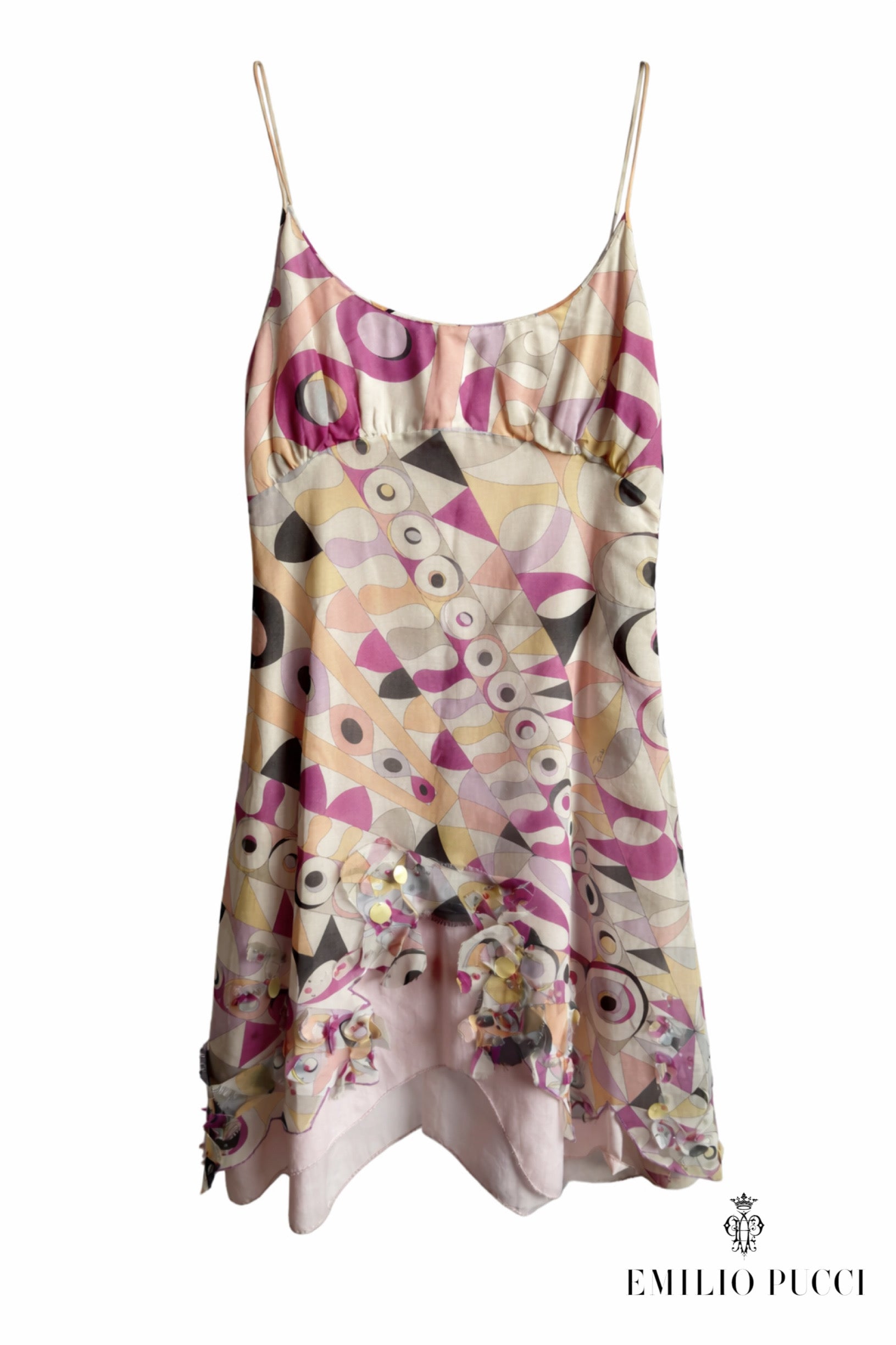 Rare 90s Emilio Pucci slip dress featuring signature psychedelic geometric prints in soft pinks, lilacs, and neutrals. Crafted in a silky, lightweight fabric with a flirty handkerchief hem and floral appliqué details. A dreamy Y2K silhouette that blends iconic Pucci vibes with romantic, feminine flair.