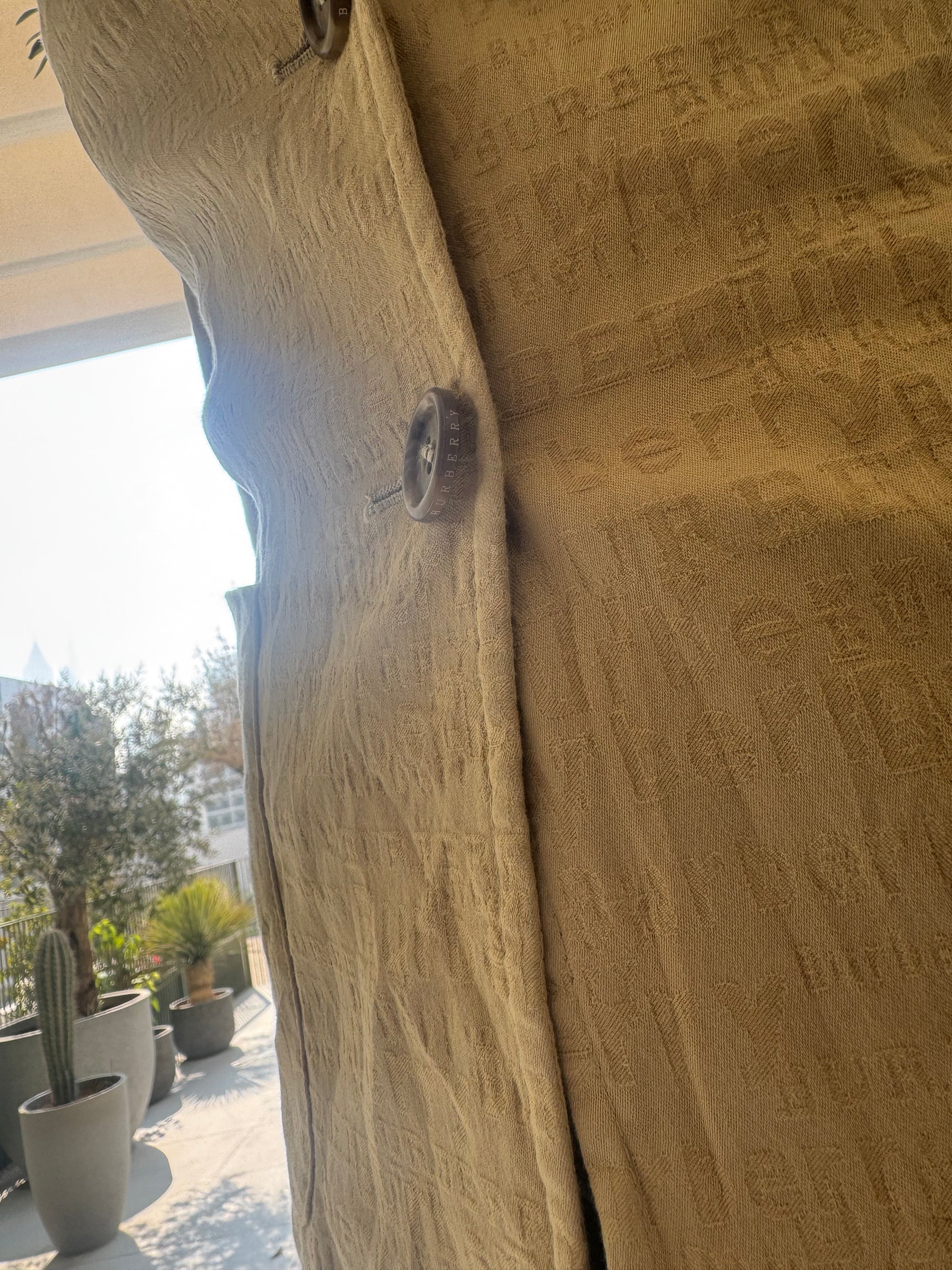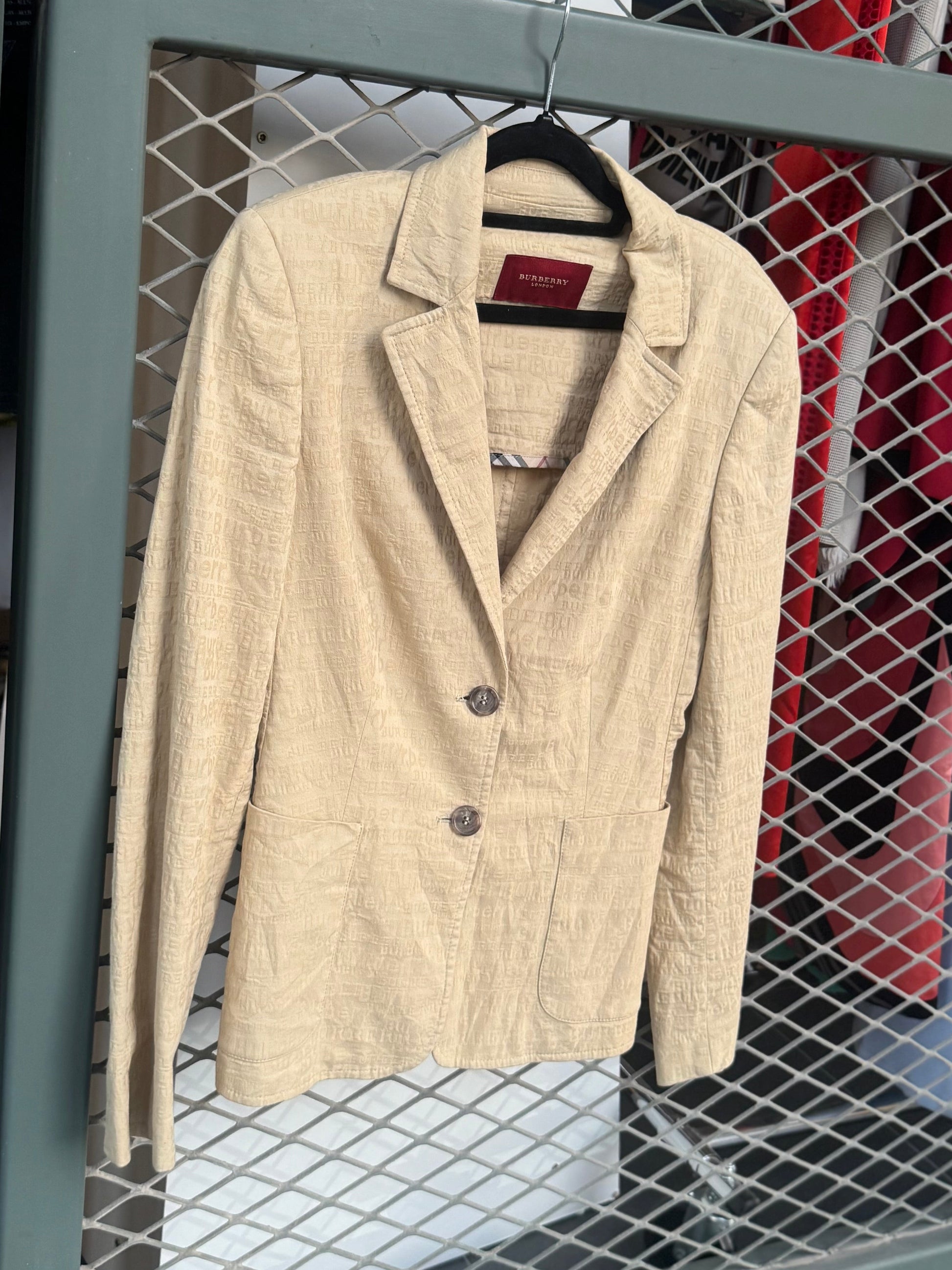 A timeless vintage Burberry blazer in a soft beige tone, featuring an all-over tonal logo jacquard. Tailored silhouette with classic notch lapels, two-button front, and patch pockets. Effortlessly chic perfect for elevating everyday looks or layering for a polished, archive-inspired outfit.