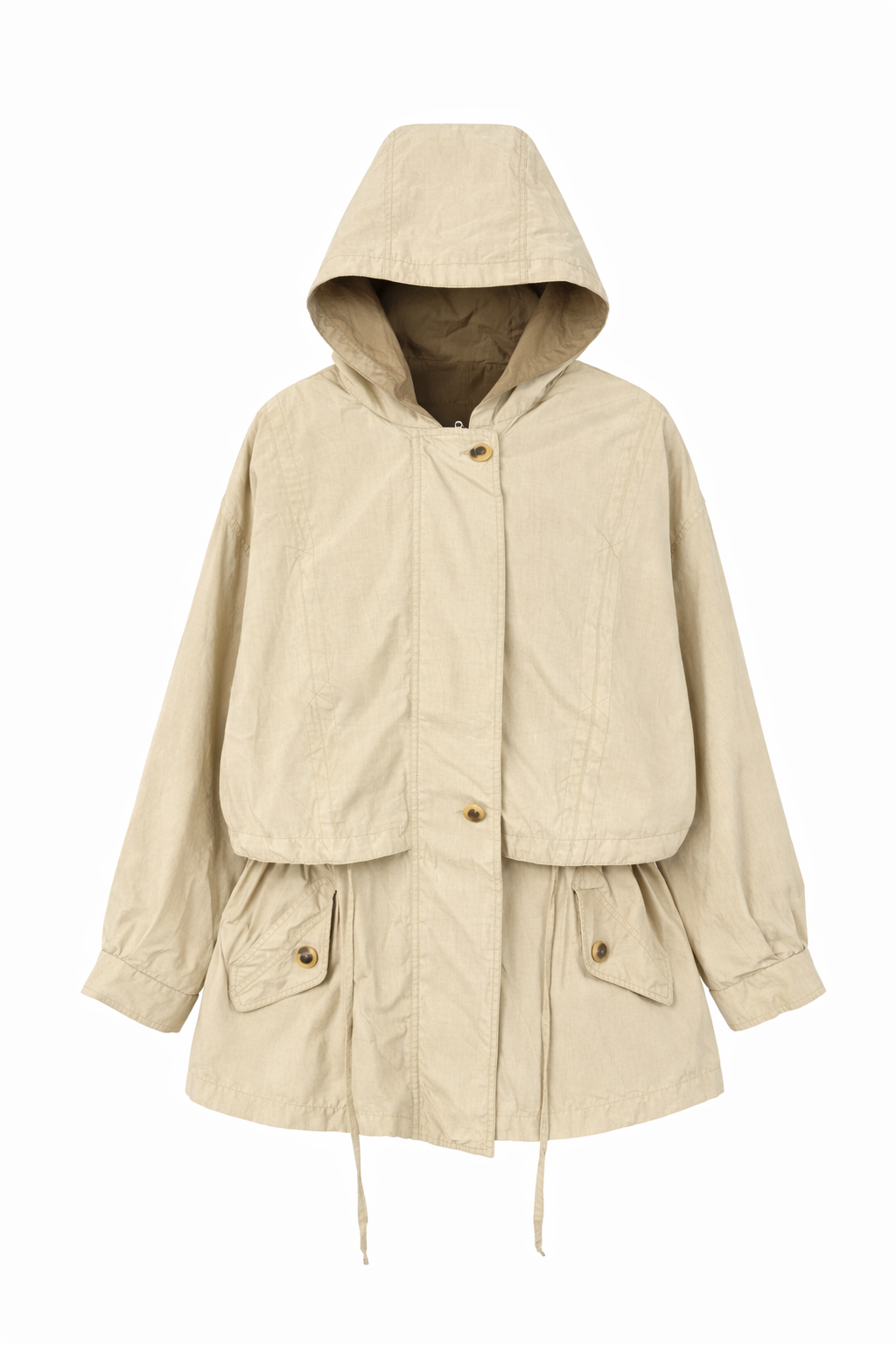 Vintage Fleet Street hooded jacket in a soft beige tone, featuring a relaxed oversized fit, adjustable drawstring waist, and statement utility pockets. Perfect worn as a jacket or styled as a chic mini dress for effortless off-duty cool.