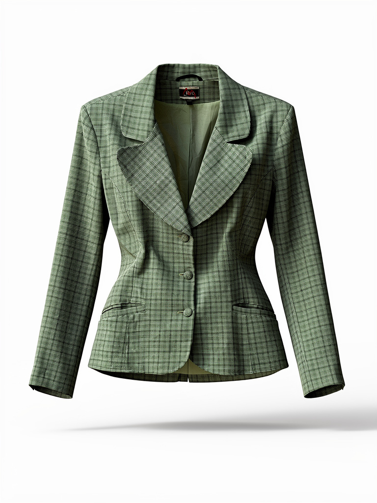 BlazerVintage MIRO tailored blazer in a muted sage-green micro check. Features a sculpted waist, wide notched lapels, single-breasted button closure, and front flap pockets. Structured yet feminine perfect with denim, trousers, or layered over a slip dress.