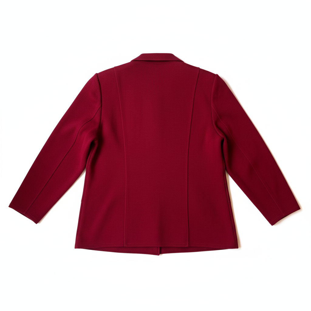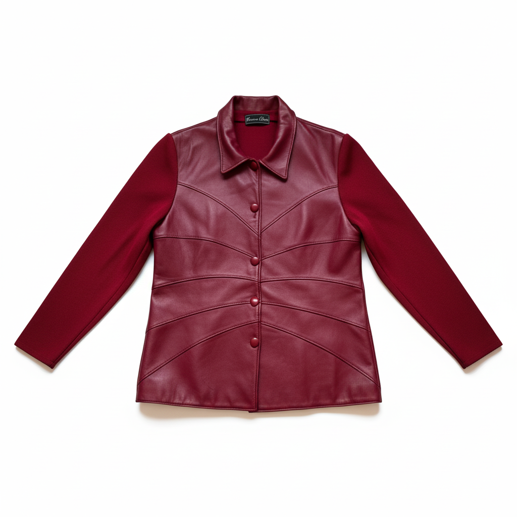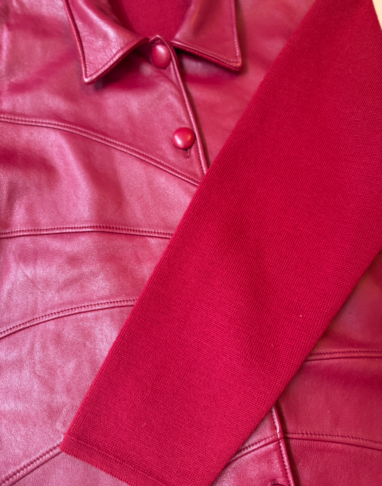 This is a stylish red jacket with a combination of leather and knit fabric. It features a unique paneled design on the front with three prominent buttons and a collar. The knit sleeves and accents add a comfortable and modern touch to the overall look.