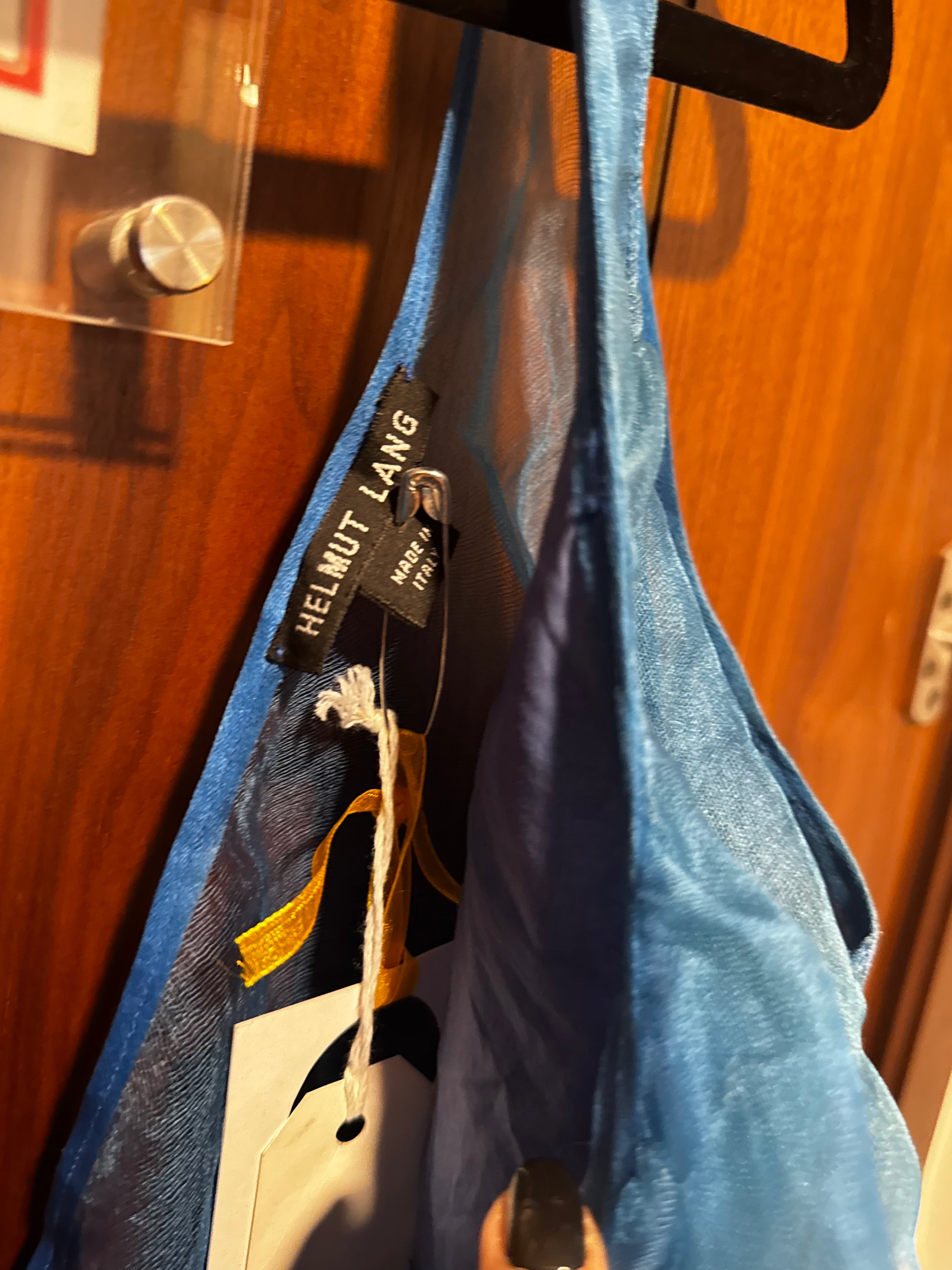 Minimalism, undone. This sheer blue organza piece plays with asymmetry and structure, featuring a sculptural draped scarf neckline and Lang’s signature architectural silhouette. A quiet statement with 90s runway energy—raw, refined, and unapologetically cool.