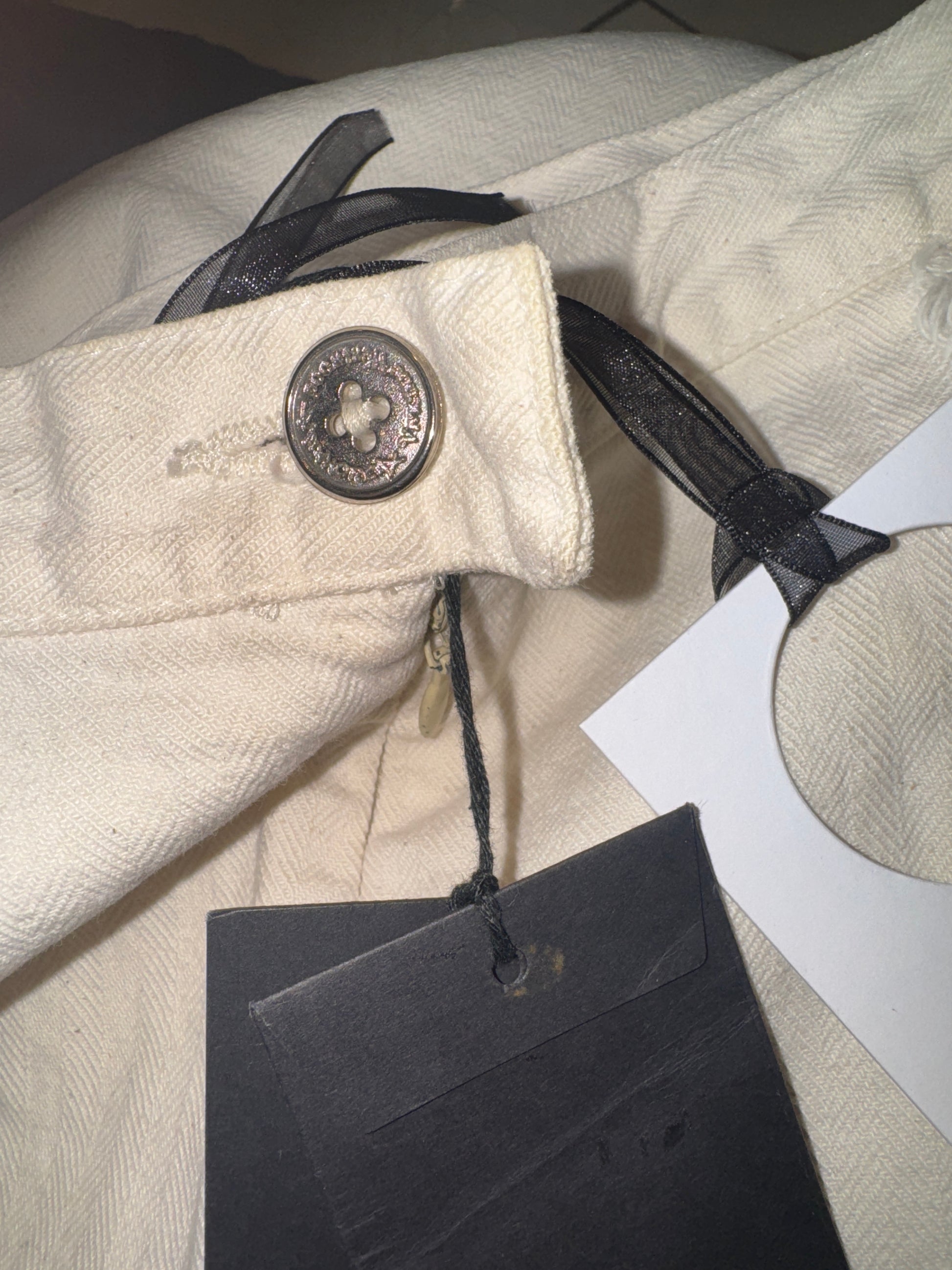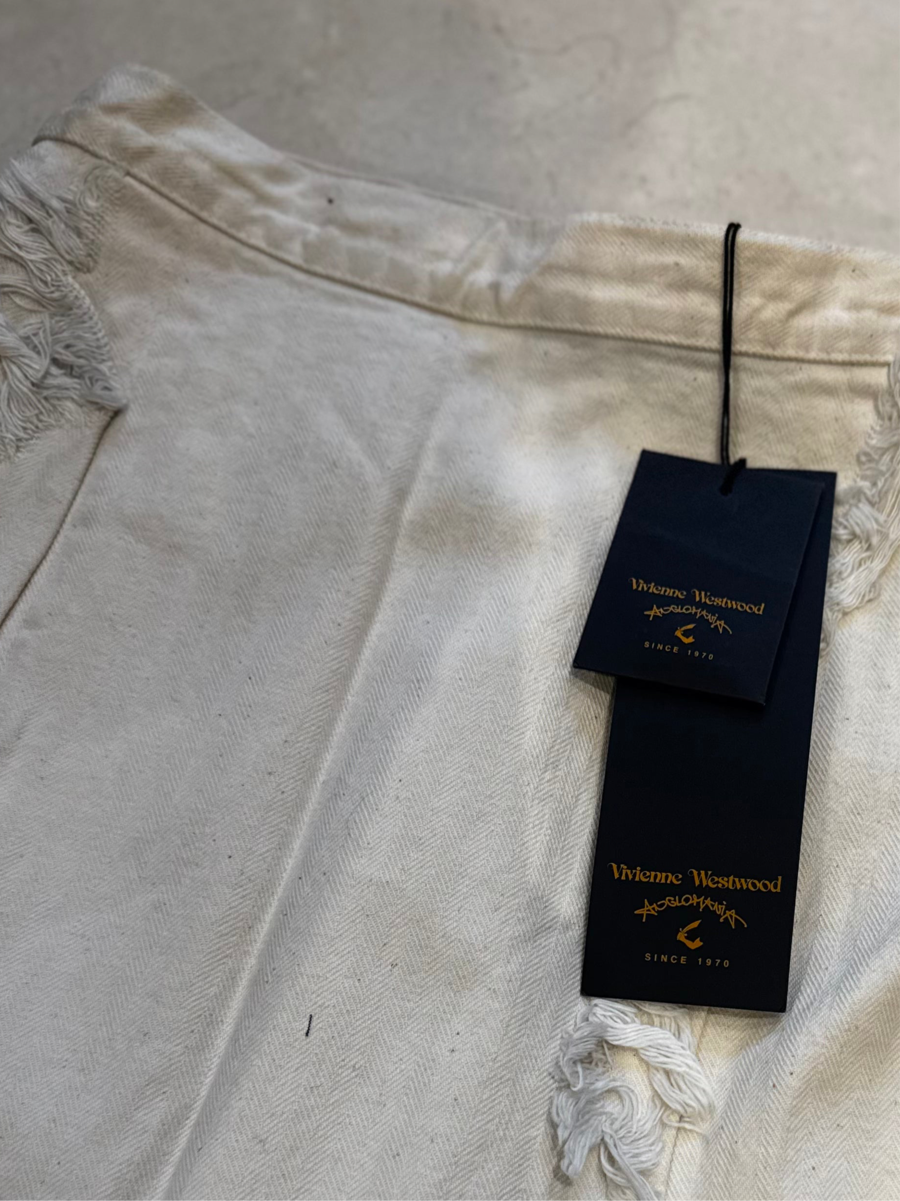 This isn’t just a skirt — it’s a piece of fashion history. A rare archival gem by Vivienne Westwood, featuring her signature asymmetry, raw fringe edges, and deconstructed elegance in an ethereal ivory tone. Nearly impossible to find today, this piece captures the rebellious romance that defined Westwood’s golden era. A must-have for true collectors and sartorial connoisseurs.